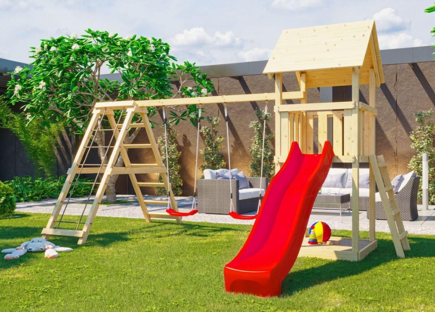 Dětské hřiště, půdorys 415 x 264 cm, věž 107 x 107 x 291 cm, červená skluzavka, houpačka a žebřík.
