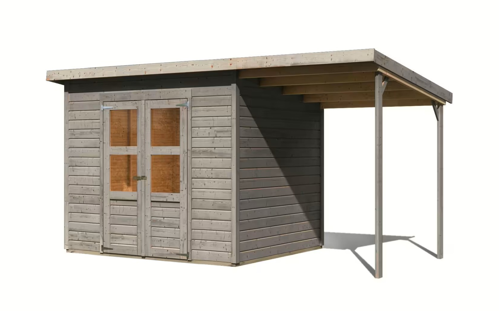dřevěný domek KARIBU MERSEBURG 5 + přístavek 166 cm (9603) světle šedý