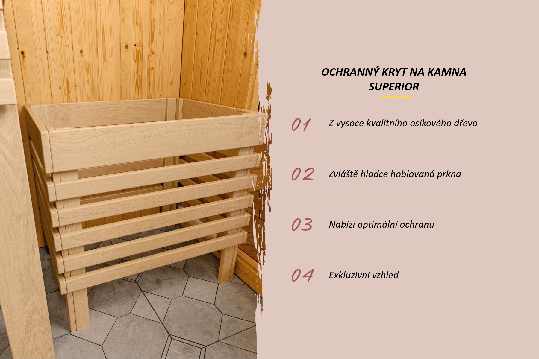 Obsahem standardního balení je 3x lavice z osikového dřeva (2x šířka 57 cm + 1x 52 cm max 250 kg) a dřevěný ochranný rám na kamna. Doporučujeme další saunové příslušenství z naší nabídky.