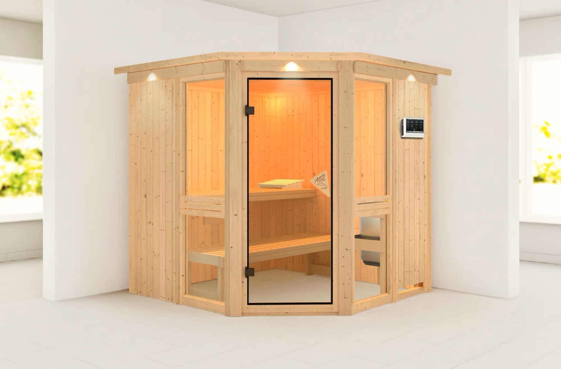 Finská sauna určená pro dvě ležící osoby. Má rozměr š 196 x h 196 x v 196 cm. Tento model finské sauny je určený do temperovaných interiérů domu nebo bytu. Stropní římsa včetně 3 LED světel šikovně dotváří atmosféru sauny. Její výrobce, firma KARIBU HOLZTECHNIK z německých Brém, dokázala svými výrobky úspěšně navázat na staletou tradici skandinávského saunování a současně do ní zapracovat dnešní moderní technologie. Sauna je celá vyrobena ze dřeva severského smrku v přírodním provedení. Dřevo pochází ze vzdáleného severu Evropy a je chemicky naprosto neošetřené (není ani namořeno ani nalakováno). V důsledku toho je prosté všech známých problematických látek, které by se v průběhu saunování mohly ze dřeva uvolňovat. Tato interiérová sauna vykazuje mimořádné tepelně-izolační vlastnosti. Stěny sauny jsou složeny z vnitřní a vnější vrstvy speciálně hlazených prken s perem a drážkou, mezi kterými je 42 mm silná tepelná izolace v podobě minerální vlny. Celková síla stěny je tak 68 mm. Zadní nebo boční nepohledové strany orientované ke stěně místnosti mají vnější stranu ze sololitu. Proto jsou při stejné tepelné izolaci o cca 10 mm tenčí než pohledové strany pokryté palubkami.