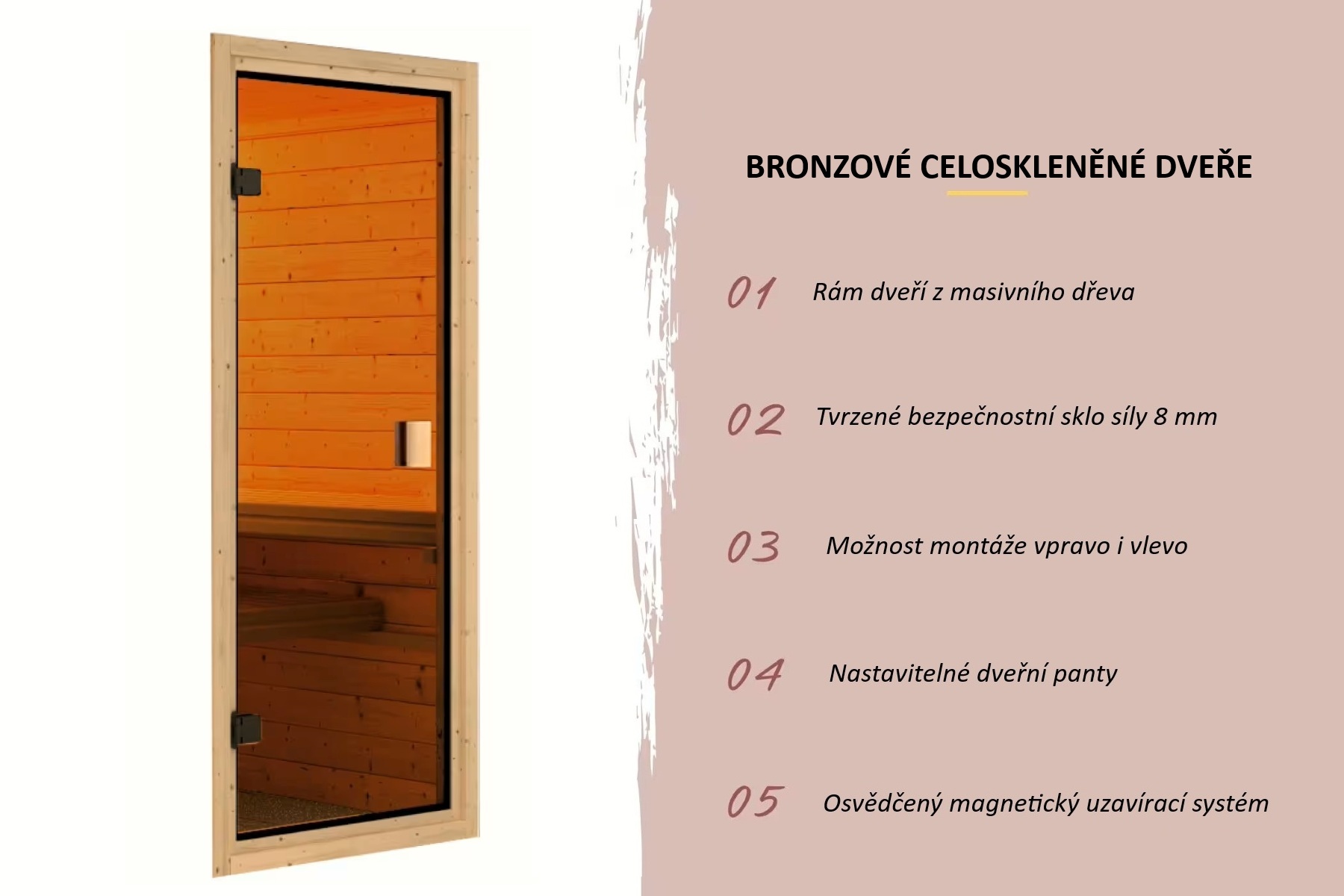 - dveře: kouřově hnědé bezpečností sklo 8 mm silné o rozměrech 81 x 180 cm