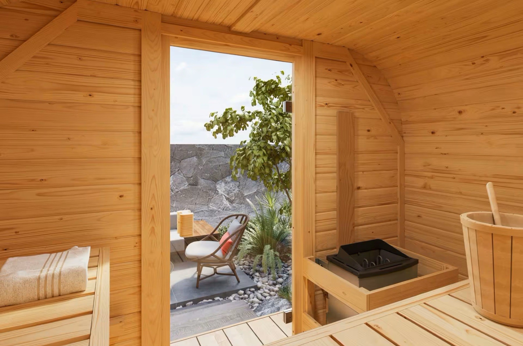 Kamna nejsou obsahem dodávky sauny. Jde o venkovní saunu, takže doporučujeme dokoupit výkonná 9 kW kamna. Vyžaduji však 400 V, jištění 16 A, kabel 5 x 2,5 mm a zapojení doporučujeme odborníkem. Velkou výhodou je rychlé vyhřátí sauny. Dodáváme s integrovaným ovladačem přímo na kamnech nebo s externím digitálním ovladačem (pro montáž zvenku sauny). Všechny modely kamen mají vnitřní části z koroze odolných materiálů a jsou dodávány včetně 18 kg saunových kamenů. Přibližnou dobu pro vytopení sauny na saunovací teplotu naleznete v záložce „Návody“ v kapitole „Přibližná doba pro nahřátí sauny.“