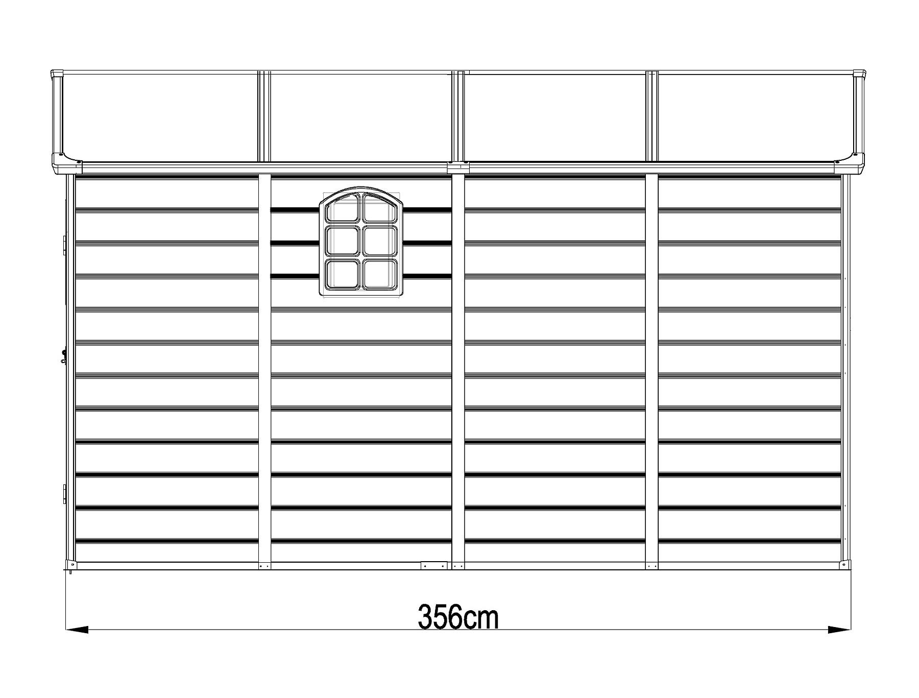 Plastový zahradní domek, vnější rozměr š 176 x d 356 x v 226 cm, zastavěná plocha 6,26 m2.