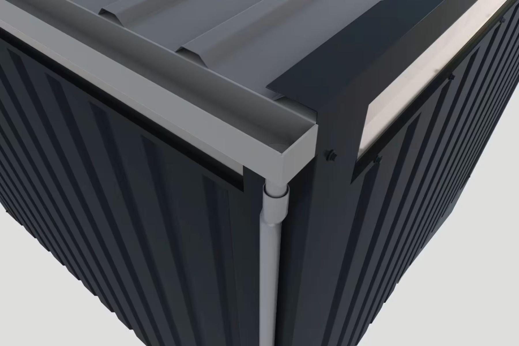 Trapézový plech je pečlivě práškově lakován, což nejen dodává estetický vzhled, ale také zajišťuje vynikající odolnost vůči nepříznivým povětrnostním vlivům. Rám z pozinkovaných čtvercových ocelových trubek zaručuje stabilitu a pevnost konstrukce. Světelný pás z umělého skla umožňuje pronikání přirozeného světla do interiéru, čímž vytváří příjemnou, světlou a pohodovou atmosféru uvnitř domku. Součástí dodávky je kvalitní okap, který efektivně odvádí dešťovou vodu.