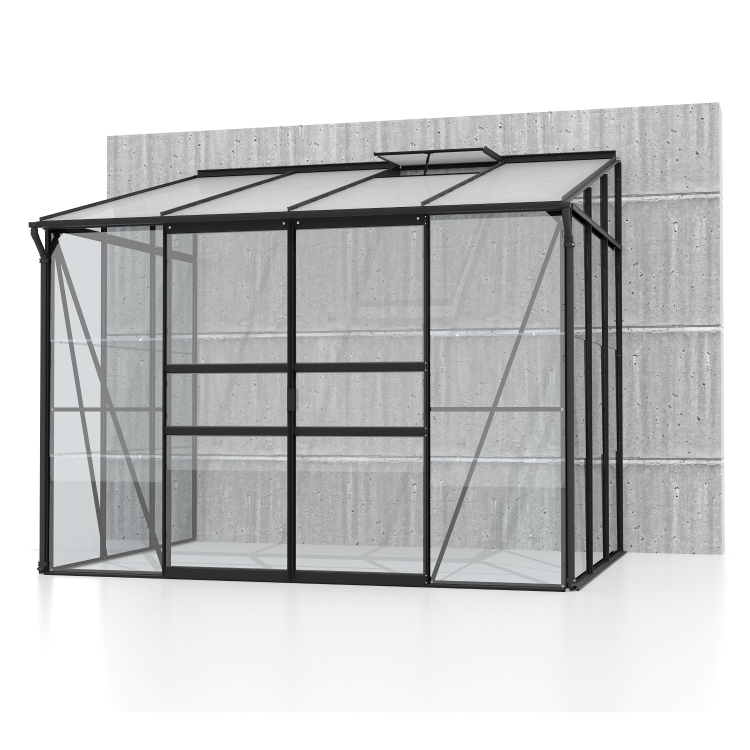 Hliníkový skleník k stene, š 2,62 x d 2,01 m, čierna farba, 1x str. okno, kalené číre sklo 3 mm + PC 6 mm, plocha 5,27 m2.