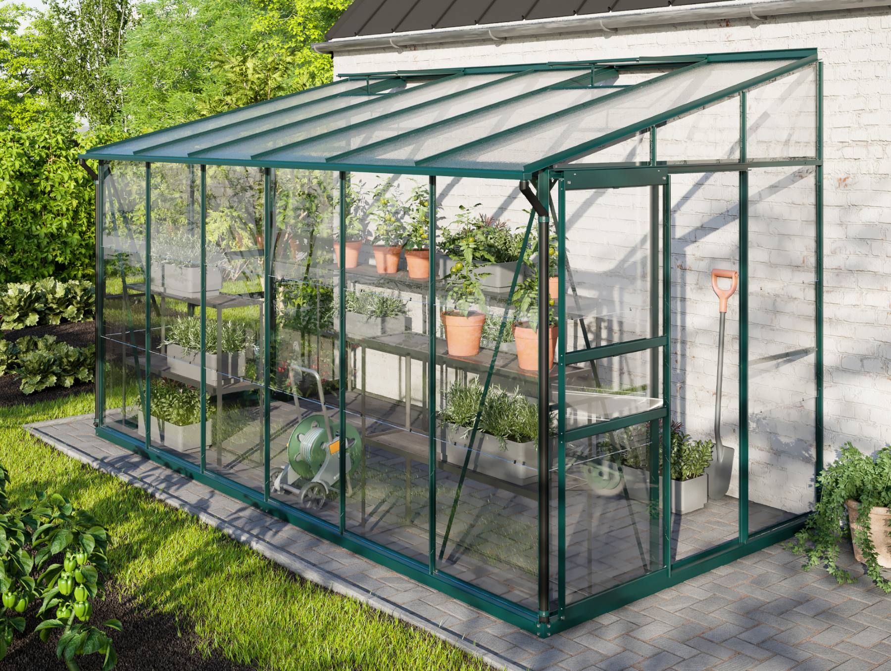Hliníkový skleník k stene, š 3,87 x d 2,01 m, zelená farba, 2x str. okno, kalené číre sklo 3 mm + PC 6 mm, plocha 7,79 m2.