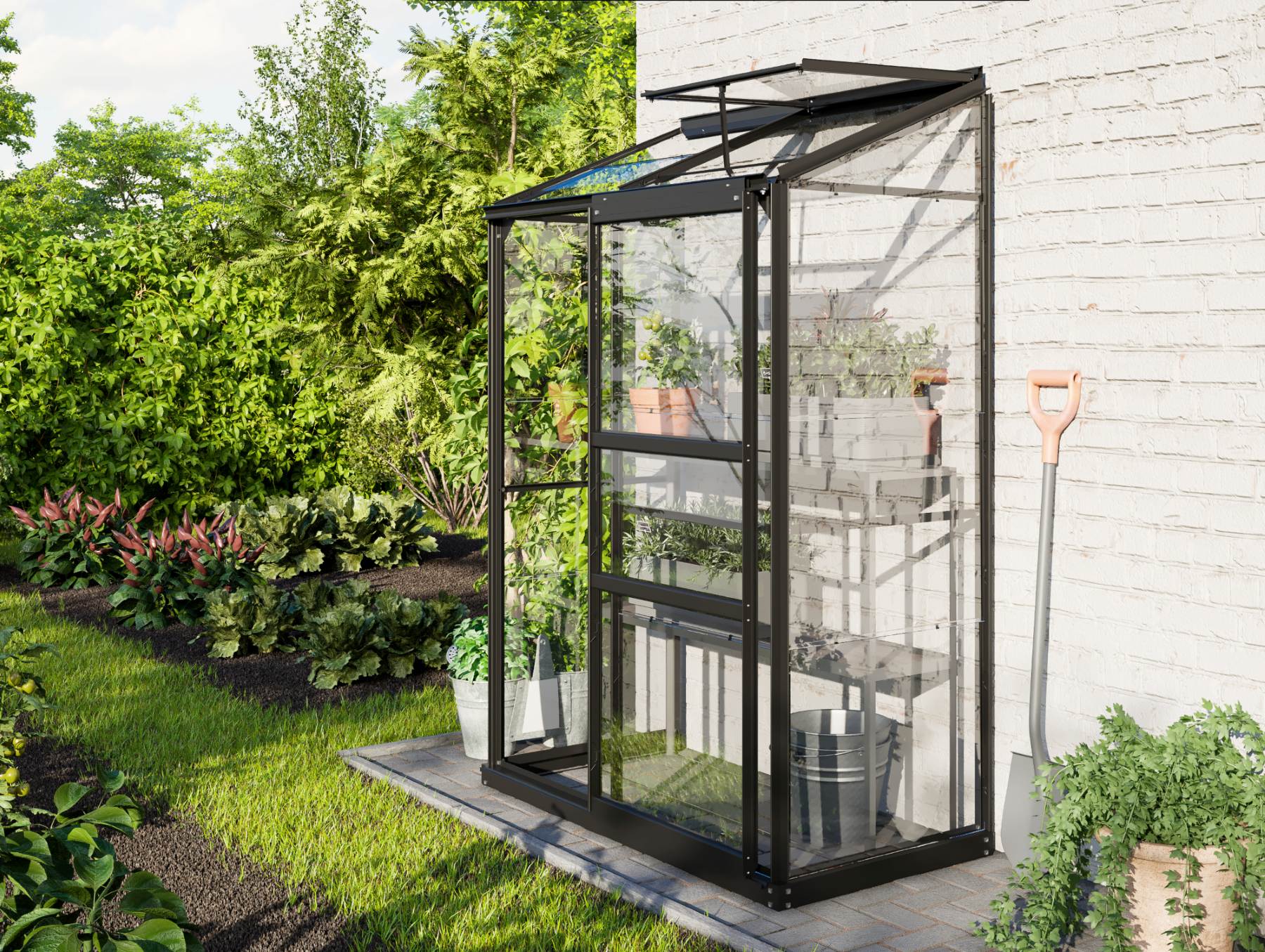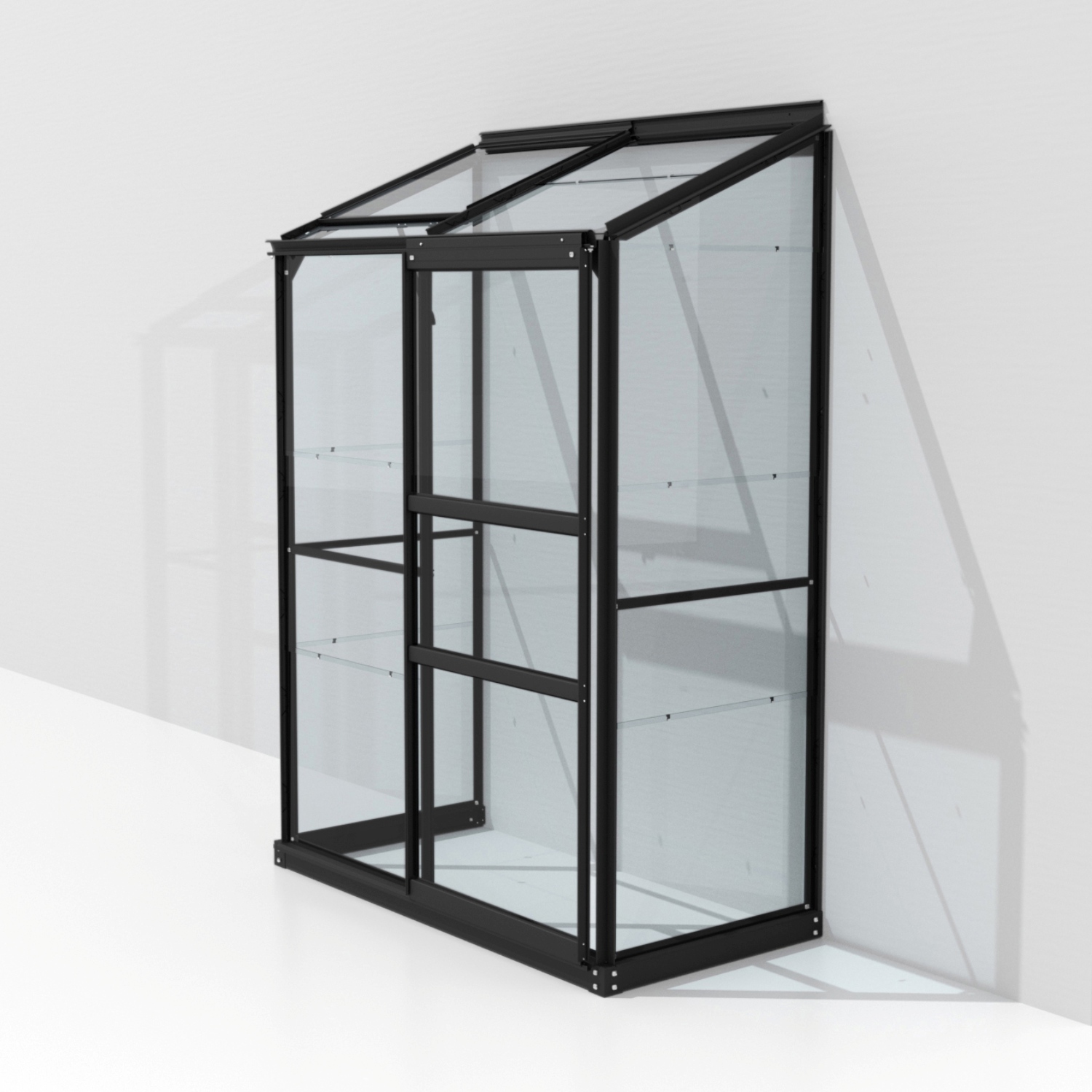 Hliníkový skleník k stene, š 1,31 x d 0,69 m, čierna farba, 1x str. okno, kalené číre sklo 3 mm, plocha 0,9 m2.