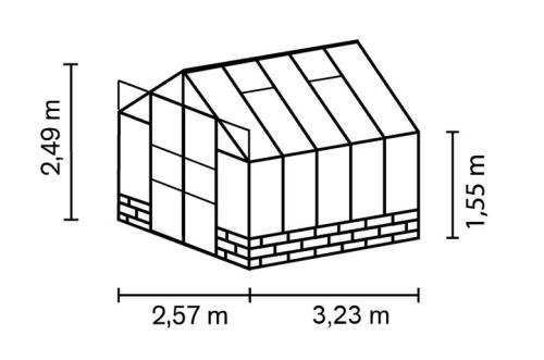 Hliníkový skleník, š 2,57 x d 3,23 m, černá barva, 4x stř. okno, kalené čiré sklo 3 mm, plocha 8,30 m2.