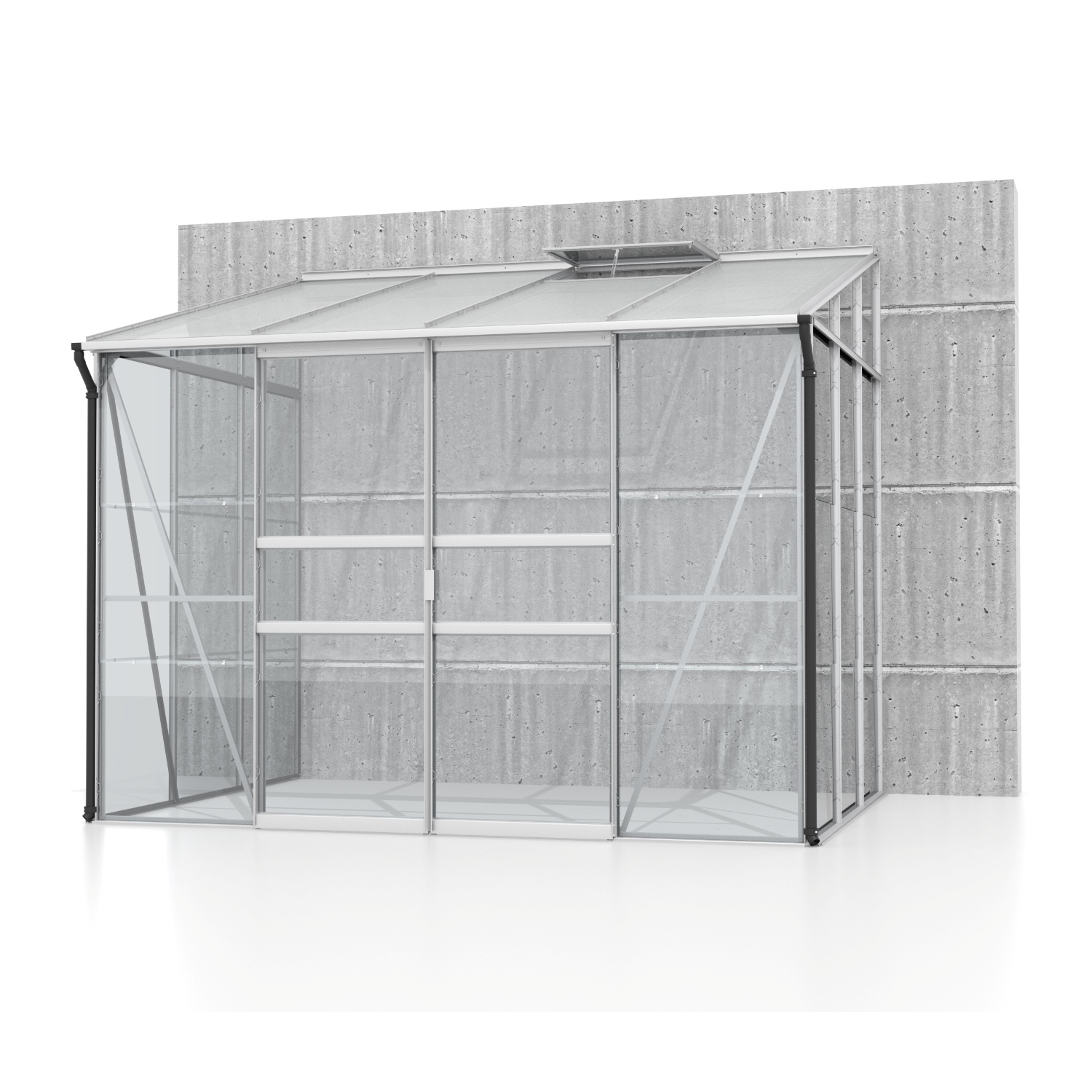 Hliníkový skleník ke stěně, š 2,62 x d 2,01 m, stříbrná barva, 1x stř. okno, kalené čiré sklo 3 mm + PC 6 mm, plocha 5,27 m2.