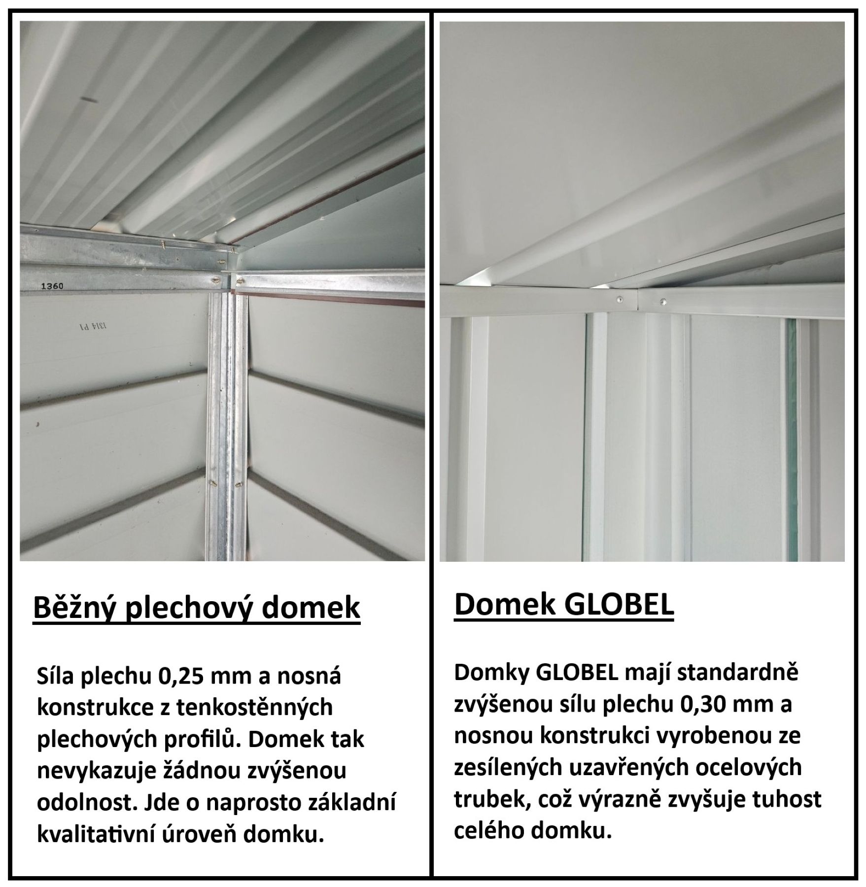 Všechny domky GLOBEL mají standardně zvýšenou sílu plechu 0,30 mm a nosnou kostru mají vyrobenou ze zesílených uzavřených ocelových trubek (běžné domky na českém a slovenském trhu mívají nosnou kostru pouze z tenkostěnné profilované ocelové lišty). Tím je zajištěna maximální odolnost a stabilita celého domku. Potvrzením použití silných ocelových plechů a masivní nosné konstrukce je i relativně vyšší hmotnost domku ve srovnání s rozměrově shodnou konkurencí. Domky GLOBEL jsou proto výrazně robustnější než ostatní domky jiných značek a mají o cca 20% větší hmotnost.