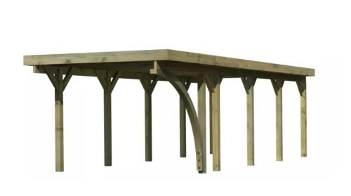 Přístřešek na auto - obdélníkový tvar a svými rozměry vyhovuje většině modelů vozidel běžných na českém trhu. Celková zastřešená plocha je 3,18 x 8,60 m. Průjezdná výška je 206 cm. Střechu podpírá deset dřevěných sloupků 11,5 x 11,5 cm. Konstrukce přístřešku je tlakově impregnována a je tak dobře chráněna proti dřevokazným houbám i hmyzu, ale i proti nepříznivým povětrnostním podmínkám. Impregnace je zdravotně nezávadná a naprosto bezpečná. Vzhledem k velkým plochám střechy a zatížení větrem je nutné připevnit přístřešek k zemi pomocí odpovídajících zemních kotev (nejsou obsahem dodávky - lze dokoupit jako příplatkové příslušenství).