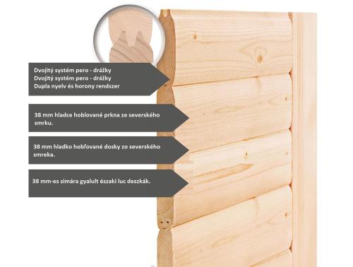 Finská sauna v naší nabídce určená pro dvě ležící osoby. Rozměry š 195 x h 169 x v 187 cm. Tento model finské sauny je určený do temperovaných interiérů domu nebo bytu. Její výrobce, firma KARIBU HOLZTECHNIK z německých Brém, dokázala svými výrobky úspěšně navázat na staletou tradici skandinávského saunování a současně do ní zapracovat dnešní moderní technologie. Sauna je celá vyrobena ze dřeva severského smrku v přírodním provedení. Dřevo pochází ze vzdáleného severu Evropy a je chemicky naprosto neošetřené (není ani namořeno ani nalakováno). V důsledku toho je prosté všech známých problematických látek, které by se v průběhu saunování mohly ze dřeva uvolňovat. Tato interiérová sauna je vyrobena z masivního dřeva síly 38 mm. Stěny sauny jsou složeny ze speciálně hlazených prken s dvojitým perem a drážkou, což garantuje neobyčejnou pevnost spoje.