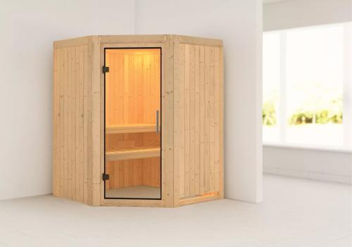 Malá fínska sauna určená až pre dve osoby. Má rozmer š 151 x h 151 x v 198 cm s rohovými dverami. Tento model fínskej sauny je určený do temperovaných interiérov domu alebo bytu. Jej výrobca, firma KARIBU HOLZTECHNIK z nemeckých Brém, dokázala svojimi výrobkami úspešne nadviazať na stáročnú tradíciu škandinávskeho saunovania a súčasne do nej zapracovať dnešné moderné technológie. Sauna je celá vyrobená z dreva severského smreka v prírodnom prevedení. Drevo pochádza zo vzdialeného severu Európy a je chemicky úplne neošetrené (nie je ani namorené ani nalakované). V dôsledku toho je prosté všetkých známych problematických látok, ktoré by sa v priebehu saunovania mohli z dreva uvoľňovať. Táto interiérová sauna vykazuje mimoriadne tepelno-izolačné vlastnosti. Steny sauny sú zložené z vnútornej a vonkajšej vrstvy špeciálne hladených dosiek s perom a drážkou, medzi ktorými je 42 mm hrubá tepelná izolácia v podobe minerálnej vlny. Celková hrúbka steny je tak 68 mm. Zadné alebo bočné nepohľadové strany orientované k stene miestnosti majú vonkajšiu stranu zo sololitu. Preto sú pri rovnakej tepelnej izolácii o cca 10 mm tenšie ako pohľadové strany pokryté palubovkami.