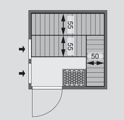 Sauna nemá vlastnú podlahu a je nutné ju umiestniť výhradne v miestnosti so zodpovedajúcou podlahovou krytinou, ideálne dlažbou. Saunu dodávame vo verzii bez stropnej rímsy (profilu) pri strope, v ktorom môže byť inštalované dodatočné LED osvetlenie.