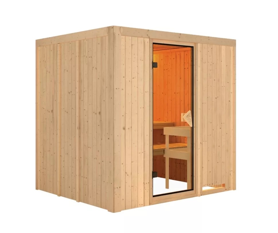 Fínska sauna určená pre dve ležiace osoby. Má obdĺžnikový tvar š 196 x h 170 x v 198 cm. Tento model fínskej sauny je určený do temperovaných interiérov domu alebo bytu. Jej výrobca, firma KARIBU HOLZTECHNIK z nemeckých Brém, dokázala svojimi výrobkami úspešne nadviazať na stáročnú tradíciu škandinávskeho saunovania a súčasne do nej zapracovať dnešné moderné technológie. Sauna je celá vyrobená z dreva severského smreka v prírodnom prevedení. Drevo pochádza zo vzdialeného severu Európy a je chemicky úplne neošetrené (nie je ani namorené ani nalakované). V dôsledku toho je prosté všetkých známych problematických látok, ktoré by sa v priebehu saunovania mohli z dreva uvoľňovať. Táto interiérová sauna vykazuje mimoriadne tepelno-izolačné vlastnosti. Steny sauny sú zložené z vnútornej a vonkajšej vrstvy špeciálne hladených dosiek s perom a drážkou, medzi ktorými je 42 mm hrubá tepelná izolácia v podobe minerálnej vlny. Celková hrúbka steny je tak 68 mm. Zadné alebo bočné nepohľadové strany orientované k stene miestnosti majú vonkajšiu stranu zo sololitu. Preto sú pri rovnakej tepelnej izolácii o cca 10 mm tenšie ako pohľadové strany pokryté palubovkami.