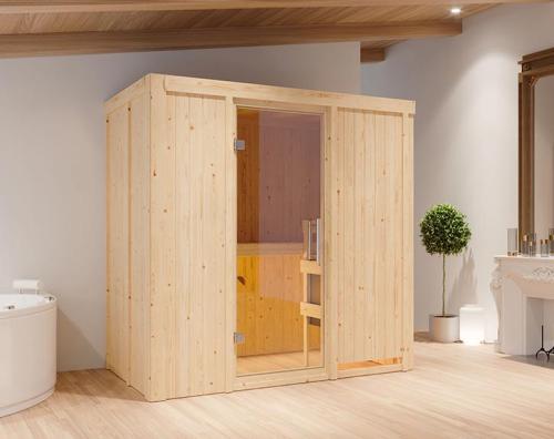 Fínska sauna určená pre dve osoby. Má rozmery š 196 x h 118 x v 198 cm. Tento model fínskej sauny je určený do temperovaných interiérov domu alebo bytu. Jej výrobca, firma KARIBU HOLZTECHNIK z nemeckých Brém, dokázala svojimi výrobkami úspešne nadviazať na stáročnú tradíciu škandinávskeho saunovania a súčasne do nej zapracovať dnešné moderné technológie. Sauna je celá vyrobená z dreva severského smreka v prírodnom prevedení. Drevo pochádza zo vzdialeného severu Európy a je chemicky úplne neošetrené (nie je ani namorené ani nalakované). V dôsledku toho je prosté všetkých známych problematických látok, ktoré by sa v priebehu saunovania mohli z dreva uvoľňovať. Táto interiérová sauna vykazuje mimoriadne tepelno-izolačné vlastnosti. Steny sauny sú zložené z vnútornej a vonkajšej vrstvy špeciálne hladených dosiek s perom a drážkou, medzi ktorými je 42 mm hrubá tepelná izolácia v podobe minerálnej vlny. Celková hrúbka steny je tak 68 mm. Zadné alebo bočné nepohľadové strany orientované k stene miestnosti majú vonkajšiu stranu zo sololitu. Preto sú pri rovnakej tepelnej izolácii o cca 10 mm tenšie ako pohľadové strany pokryté palubovkami.
