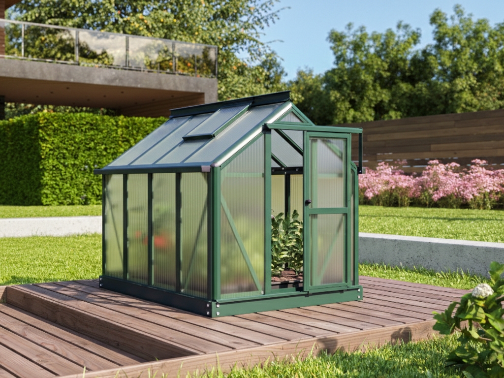 Hliníkový miniskleník na bylinky, š 0,87 x d 1,11 m x v 0,91 m, zelená farba, 1x str. okno, polykarbonát 4 mm, 2x dvere, základňa v cene, plocha 0,96 m2.