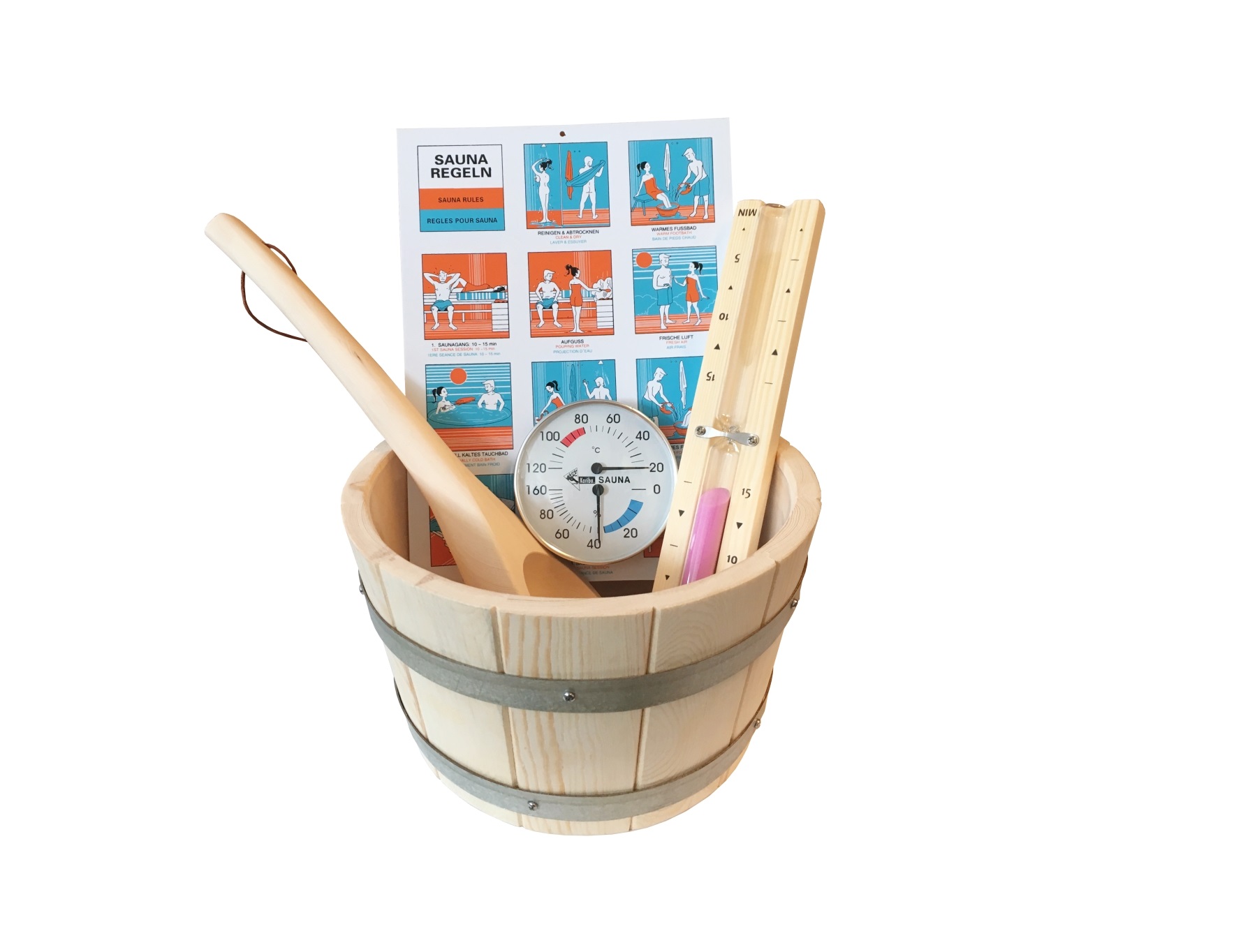 Náš tip pre dokonalý zážitok zo sauny. Saunový balíček obsahuje všetko základné príslušenstvo, ktoré potrebujete pre dokonalé saunovanie. Aby bola teplota neustále pod kontrolou, obsahuje súprava teplomer aj vlhkomer. Má priemer 10 cm, kovové puzdro a chrómovaný rám. Presýpacie hodiny ukazujú čas saunovania (15 minút) a dajú tak impulz k ochladzovací fázi. Súprava ďalej obsahuje smrekové vedro na vodu s plastovou vložkou a drevenou lyžicu.