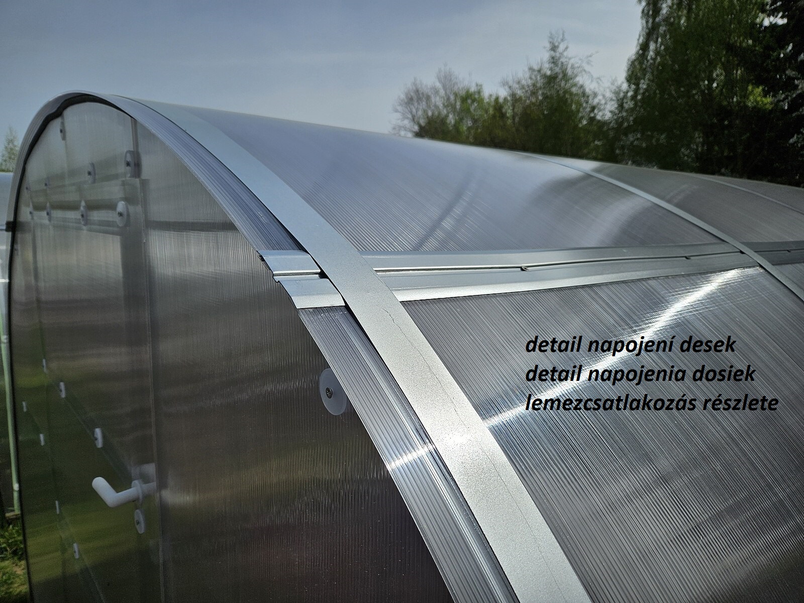 Tento model skleníka obsahuje oceľové vodorovné spojovacie lišty na plastové presklenie, takže polykarbonátové dosky sú dodávané už predrezané na menšie formáty (max. 1,05 x 2 m) a zabalené v kartóne. Z týchto menších formátov je možné už veľmi jednoducho dorezať potrebné zaoblené dielce na opláštenie. Nemusíte tak zložito manipulovať s celými veľkými polykarbonátovými doskami. Skleník je možné aj oveľa jednoduchšie uskladniť. ODPORÚČAME!