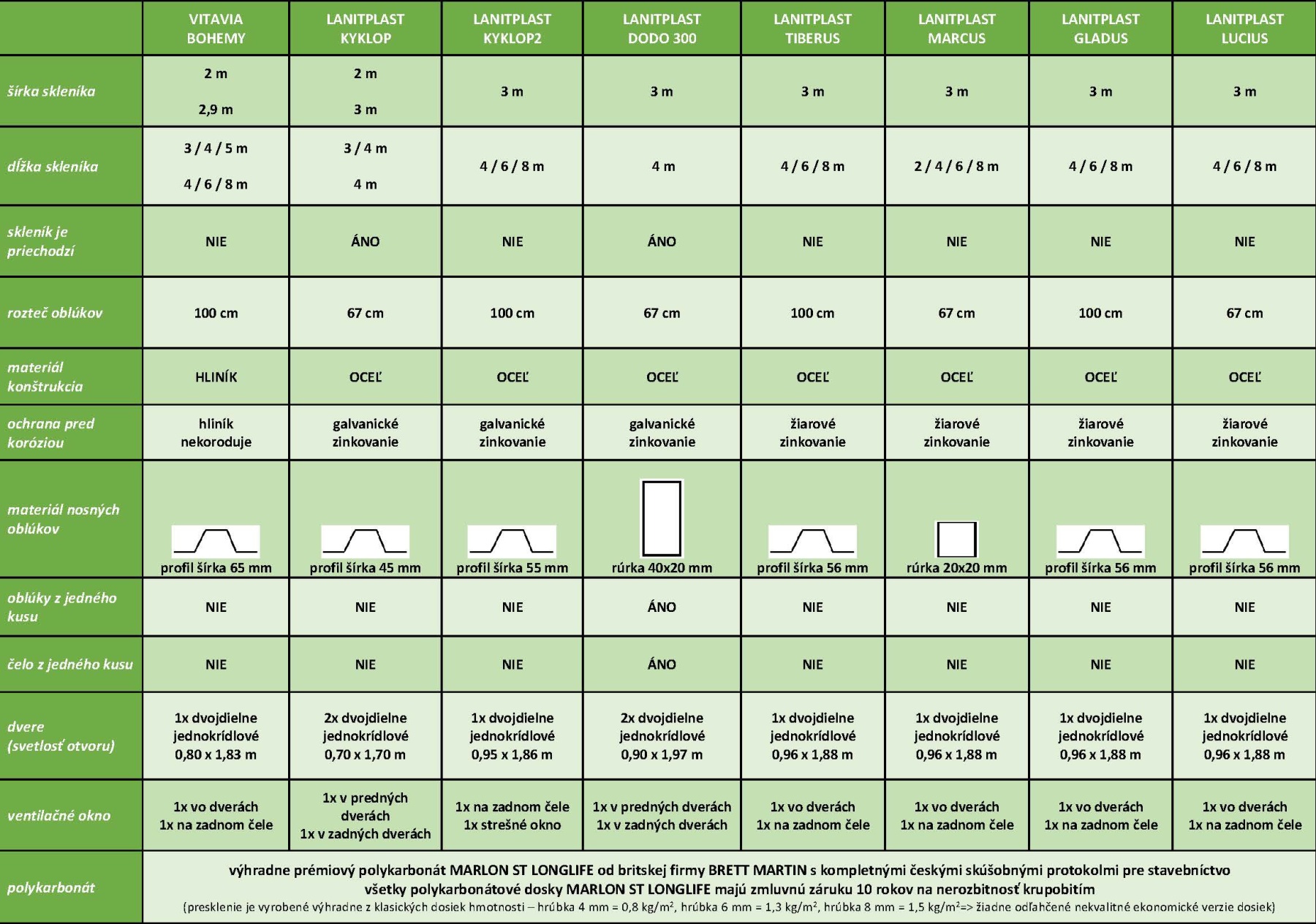 Prémiový britský dvojstenný polykarbonát 4 mm so silným UV filtrom (preto na slnku nežltne a nekrehne). Z dôvodu zaistenia maximálnej kvality skleníka dodávame ku konštrukcii presklenia z kvalitného polykarbonátu MARLON (výrobca Brett Martin Veľká Británia), ktorý v SR prešiel náročnými testami v štátom akreditovaných skúšobniach ako stavebný materiál. Navyše disponuje skúšobným protokolom zo Štátneho zdravotného ústavu Praha, ktorý potvrdzuje, že sa z polykarbonátu neuvoľňujú žiadne škodlivé látky. Môžete tak nerušene pestovať zeleninu bez obáv o svoje zdravie. Zmluvná predĺžená záruka 10 rokov na nerozbitnosť polykarbonátu krupobitím je u skleníkov od LANIT PLASTU samozrejmosťou.