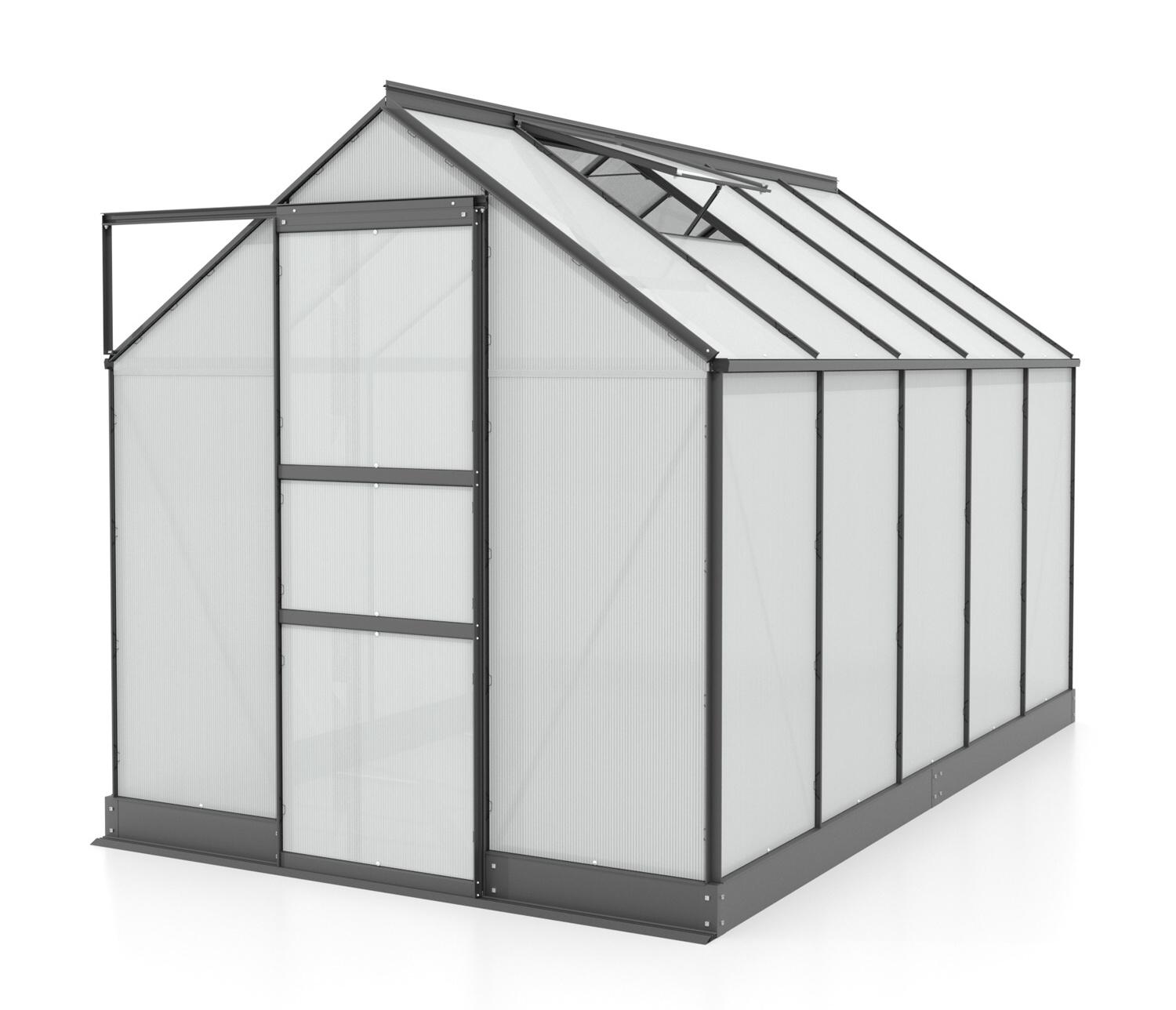 Hliníkový skleník, š 1,95 x d 3,23 m, čierna farba, 2x str. okno, polykarbonát 6 mm, základňa v cene, plocha 6,30 m2.