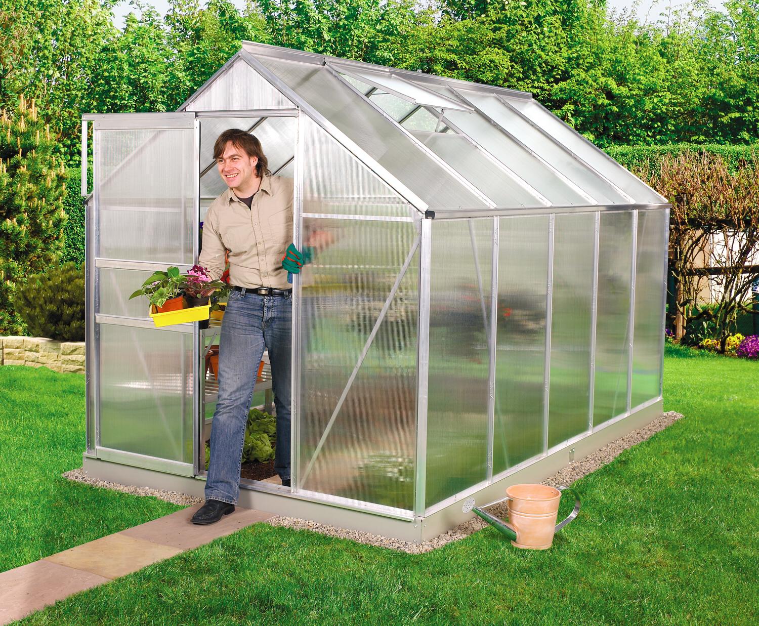 Hliníkový skleník, š 1,95 x d 3,21 m, strieborná farba, 2x str. okno, polykarbonát 6 mm, plocha 6,26 m2.