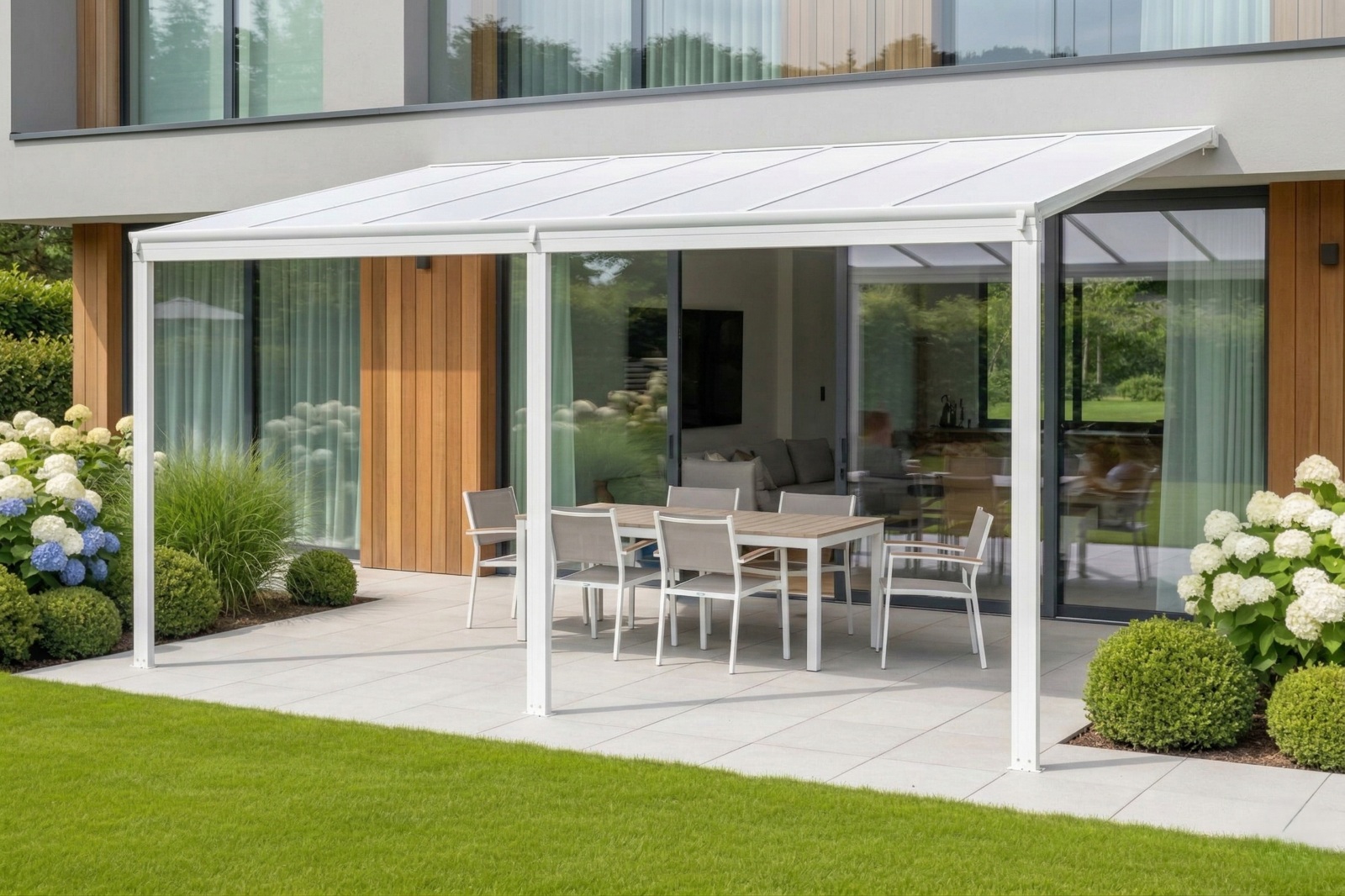 Hliníková pergola k stene, v ktorej nájdete príjemné miesto odpočinku hneď vedľa vášho domu. Konštrukcia pergoly je z odolnej hliníkovej zliatiny a je nastriekaná práškovou vypaľovanou farbou (komaxit), a preto trvalo odoláva prírodným klimatickým vplyvom. Strecha je vyrobená z polykarbonátových komôrkových dvojstenných dosiek hrúbky 6 mm, ktoré dodávame v 3 odtieňoch - číre alebo mliečne biele priesvitné (tvz. OPÁL) alebo dymovo hnedé (BRONZ). Z dôvodu zaistenia maximálnej kvality používame na strechu pergoly výhradne prémiové komôrkové polykarbonátové dosky MARLON ST LONGLIFE (výrobca BRETT MARTIN Veľká Británia), ktoré v ČR prešli náročným testami v štátom akreditovaných skúšobniach ako stavebný materiál (požiarne skúšky, mechanické skúšky). Na nerozbitnosť polykarbonátovej strechy krupobitím poskytujeme zmluvnú predĺženú záruku 10 rokov.