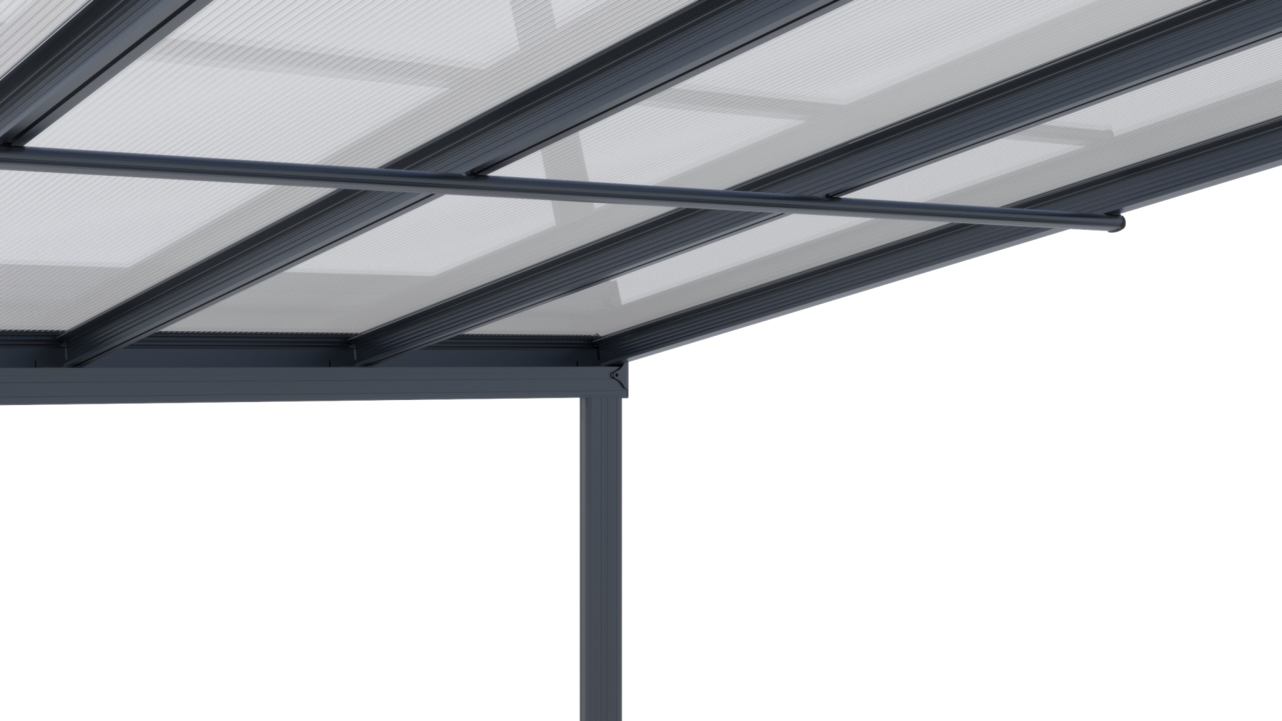 Hliníková pergola k stene, v ktorej nájdete príjemné miesto odpočinku hneď vedľa vášho domu. Konštrukcia pergoly je z odolnej hliníkovej zliatiny a je nastriekaná práškovou vypaľovanou farbou (komaxit), a preto trvalo odoláva prírodným klimatickým vplyvom. Strecha je vyrobená z polykarbonátových komôrkových dvojstenných dosiek hrúbky 6 mm, ktoré dodávame v 3 odtieňoch - číre alebo mliečne biele priesvitné (tvz. OPÁL) alebo dymovo hnedé (BRONZ). Z dôvodu zaistenia maximálnej kvality používame na strechu pergoly výhradne prémiové komôrkové polykarbonátové dosky MARLON ST LONGLIFE (výrobca BRETT MARTIN Veľká Británia), ktoré v ČR prešli náročným testami v štátom akreditovaných skúšobniach ako stavebný materiál (požiarne skúšky, mechanické skúšky). Na nerozbitnosť polykarbonátovej strechy krupobitím poskytujeme zmluvnú predĺženú záruku 10 rokov.