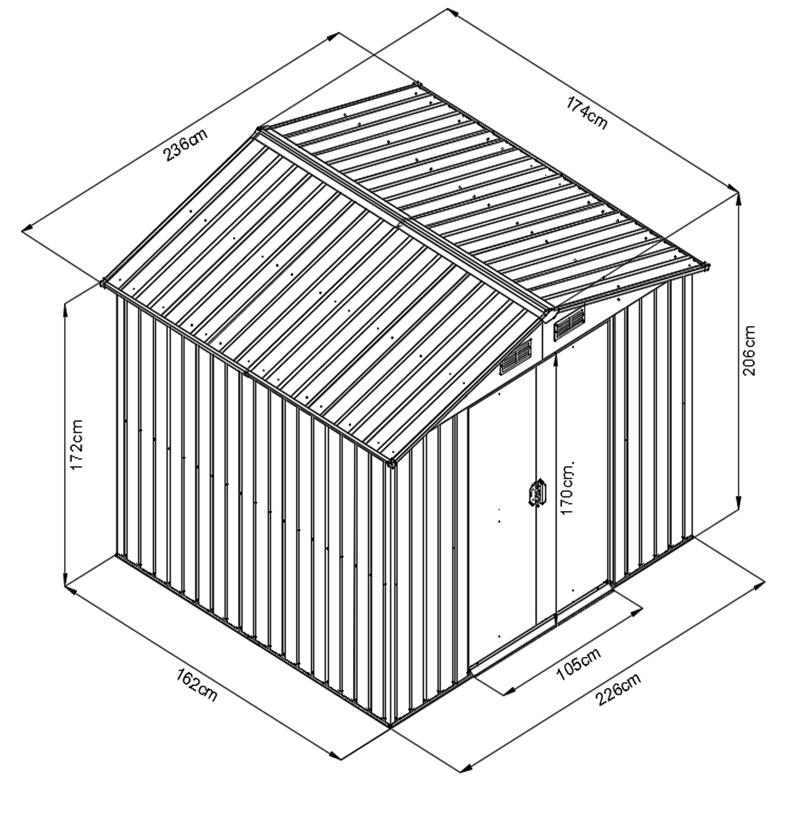 Domček je možné použiť na uskladnenie záhradkárskych, športových, bazénových, grilovacích, kempingových, motoristických a ďalších potrieb. Ide o jeden z najkvalitnejších domčekov na slovenskom trhu so silou steny 0,25 mm. Moderný dizajn, farba, jednoduchá montáž, celoročné použitie. Kvalitný materiál s povrchovou úpravou - elektrolyticky pozinkovaný plech s žiarovo nanesenú farbou. Sedlová strecha, čelné posuvné dvere. Možnosť uzamknutia (zámok nie je obsahom dodávky).