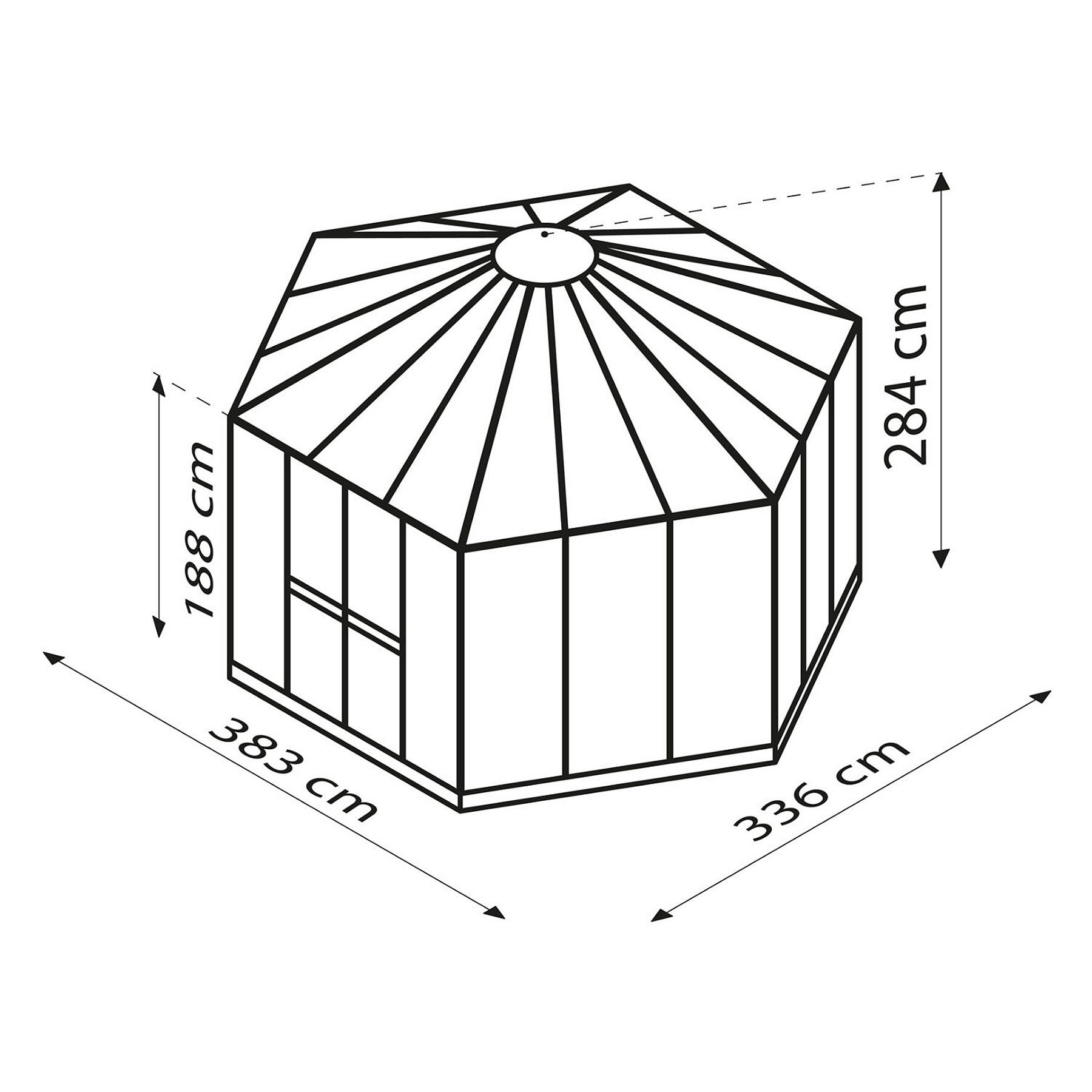 Hliníkový šesťstenný pavilón, priemer 3,20-3,80 m, čierná farba, steny bezp. sklo 3 mm + strecha polykarbonát 6 mm.