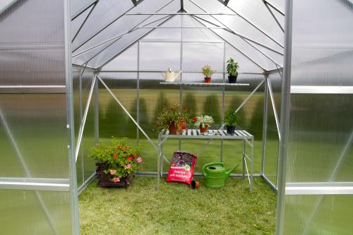 Obsahom balenia sú dvojkrídlové posuvné dvere (š x v otvoru = 1,22 x 1,91 m), AL profily, presklenie, 2x strešné ventilačné okno s manuálnym otváraním, všetok spojovací materiál + pozinkovaná základňa. Ku skleníku je možné dokúpiť množstvo nadštandardného príslušenstva - poličky, regály, ďalšie vetracie strešné i bočné okienka, automatické otvárače k týmto okienkam, odkvapové sady, teplomery, vlhkomery, zavlažovacie zariadenia, elektrické odporové vykurovanie pôdy.