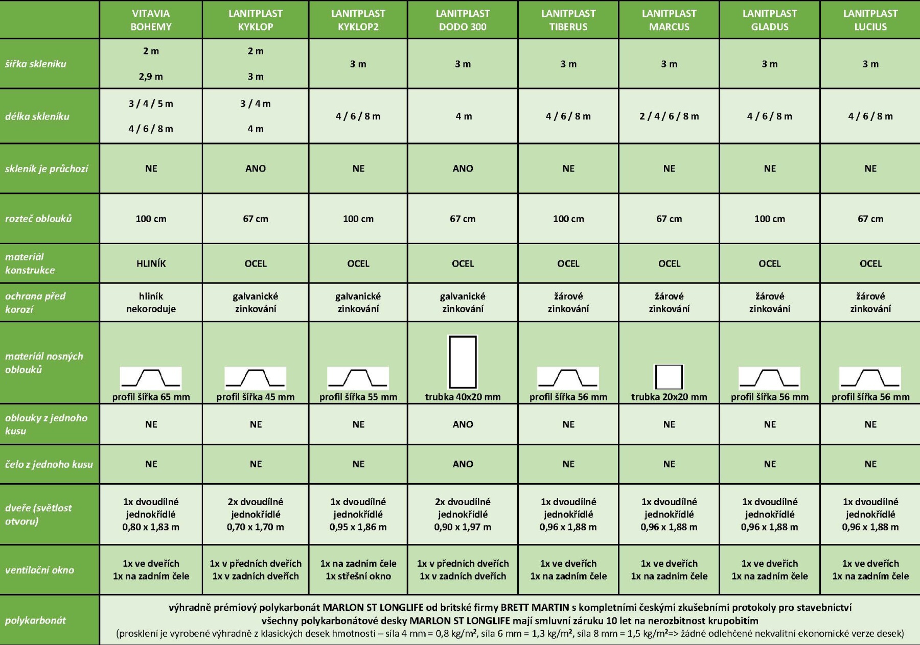 Konstrukce - konstrukce skleníku je sešroubovaná z pozinkovaných omega profilů síly 0,70 - 0,85 mm. Materiál profilů je galvanicky pozinkovaný. Jednotlivá žebra nosných oblouků jsou od sebe vzdálena pouhých 60 - 80 cm, což je velká výhoda tohoto modelu skleníku oproti jiným výrobkům na českém trhu. Malá rozteč oblouků 0,6 - 0,7 m garantuje vysokou únosnost celé konstrukce skleníku. Přední a zadní čela skleníku mají vestavěné dvojité dveře, takže skleníkem je možné procházet z obou stran. Pokud otevřete horní část dveří na obou koncích skleníku, zajistíte tím pohodlné větrání celého skleníku, aniž by do něj měly přístup děti nebo domácí zvířata. V případě, že nechcete montovat druhé dveře v zadní části skleníku, je možné do stěny umístit větrací okénko, do kterého lze namontovat automatický otvírač LANITPLAST (k zakoupení jako doplňkové příslušenství).